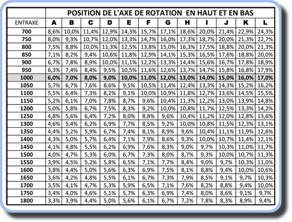 de pente grâce aux trous repérés (voir schéma et tableau en fonction du choix de la pente).